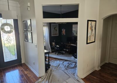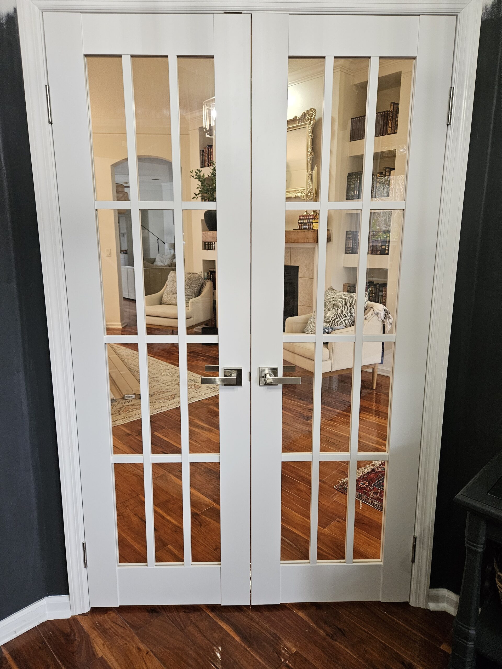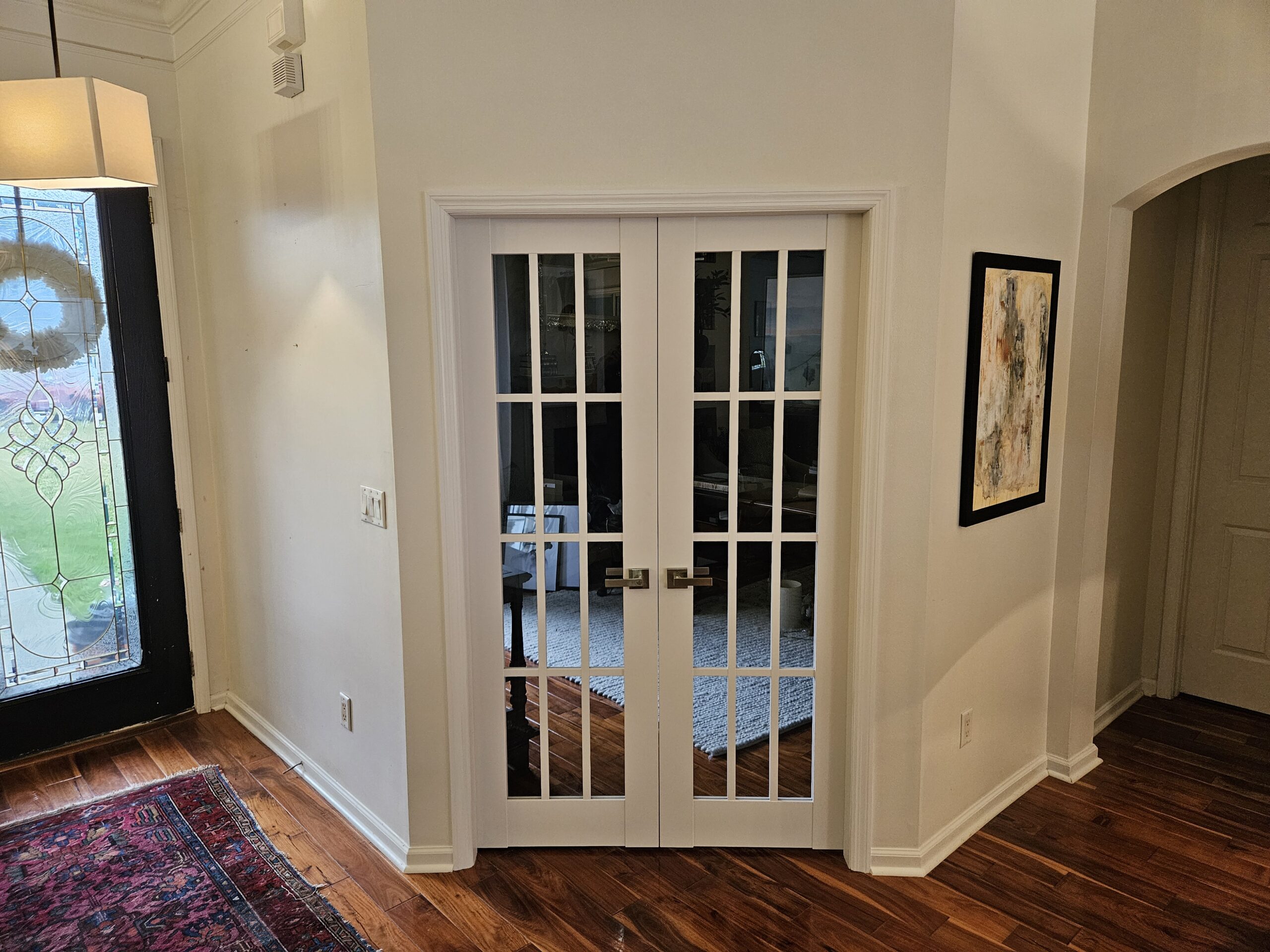 The transformation was dramatic. What was once an open arched doorway is now an elegant entrance featuring white 12-lite French doors that provide both the privacy and soundproofing the homeowner needed for their home office. The brushed nickel hardware adds a modern touch, and the seamless integration with the existing flooring and walls makes it look like a high-end, built-in feature.