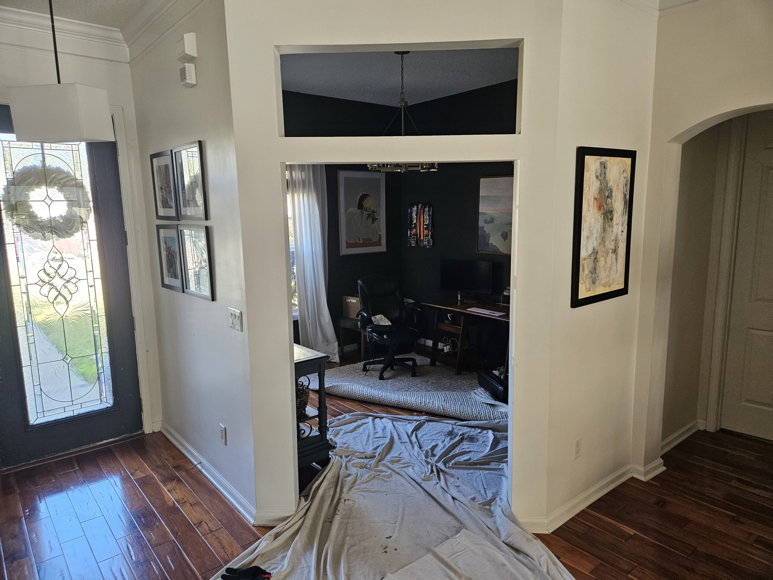 The existing entrance to the home office featured an open doorway with a decorative transom opening above it. While visually appealing, the open doorway provided no privacy or sound barrier—a problem for a homeowner who needed a quiet, enclosed workspace.