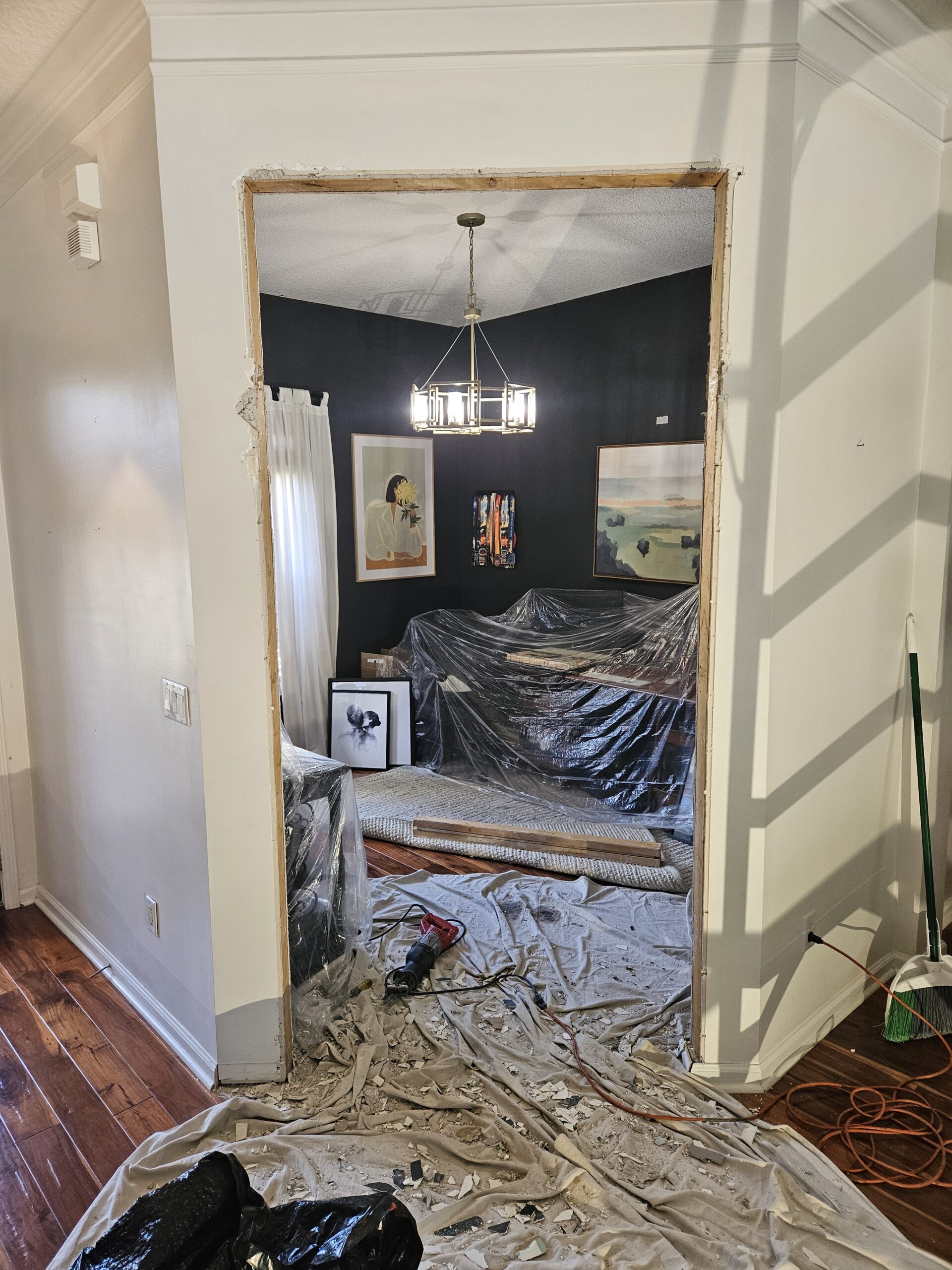 Here’s a detailed look at how I transformed this space with a custom French door installation, complete with structural modifications, transom enclosure, drywall work, and flooring adjustments.