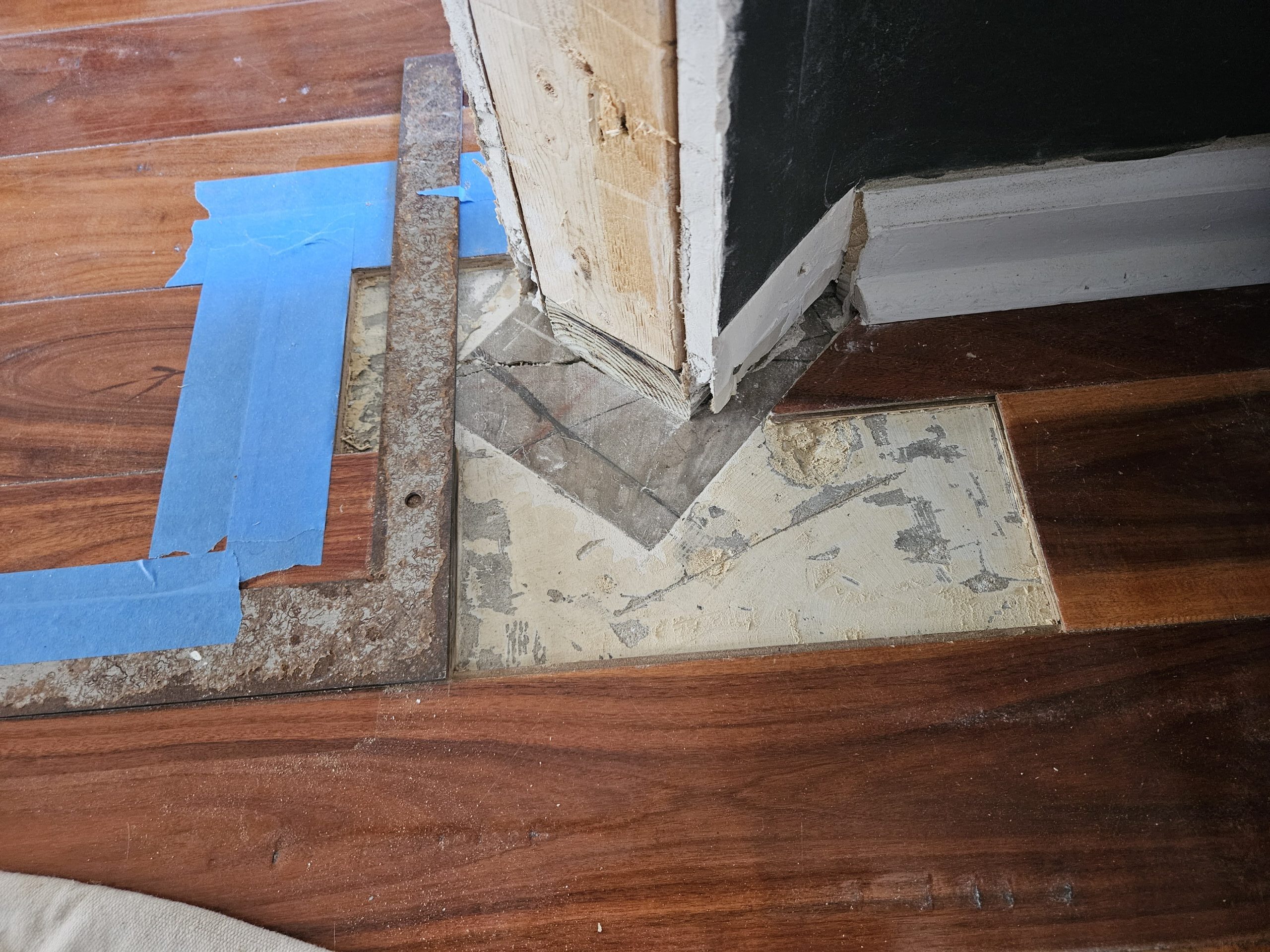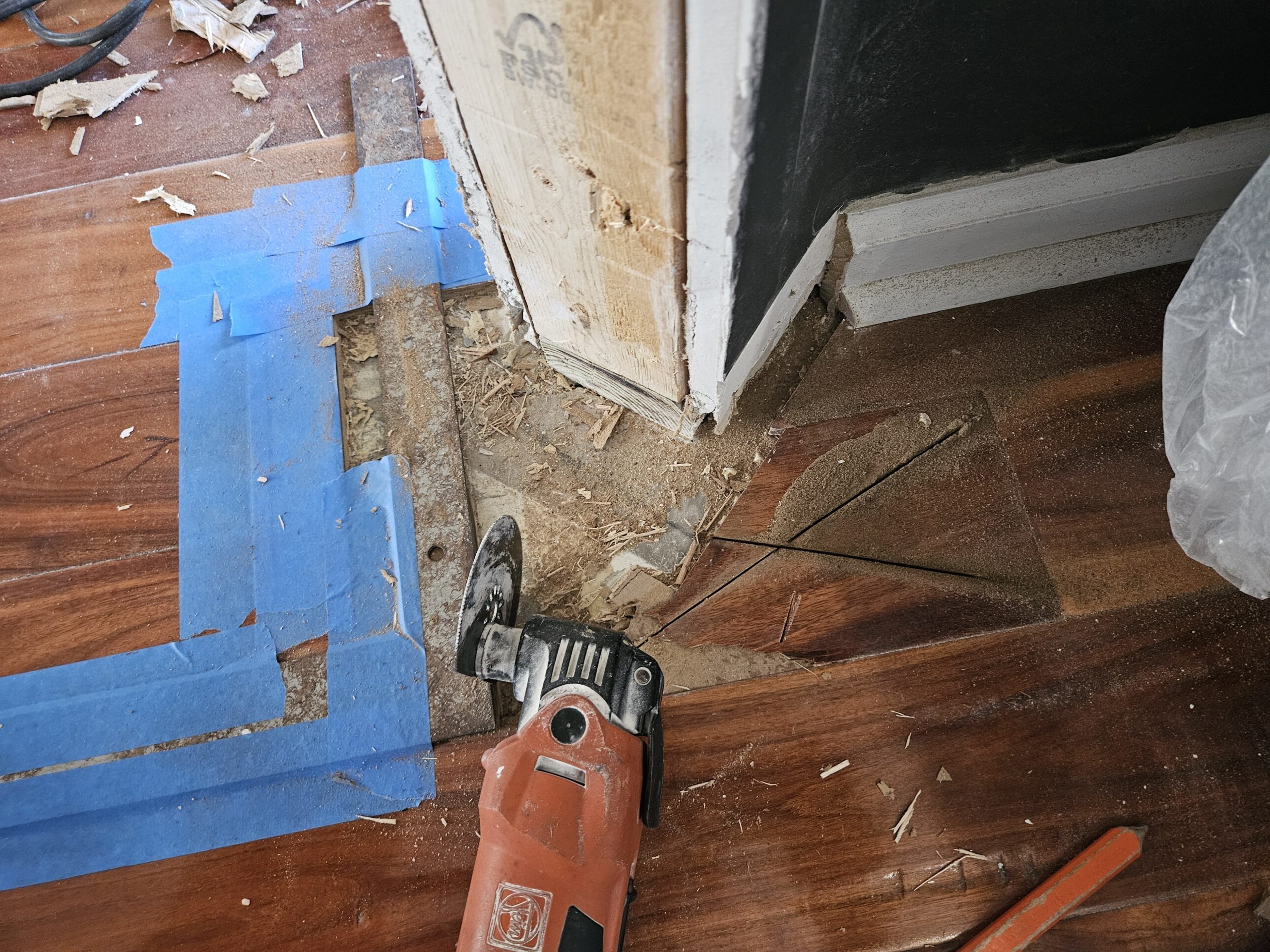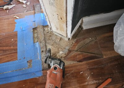 What this exposed: When I widened the opening, it revealed sections of the concrete floor slab where the laminate flooring didn’t extend. This would require custom flooring work to maintain a seamless, professional appearance—more on that later.
