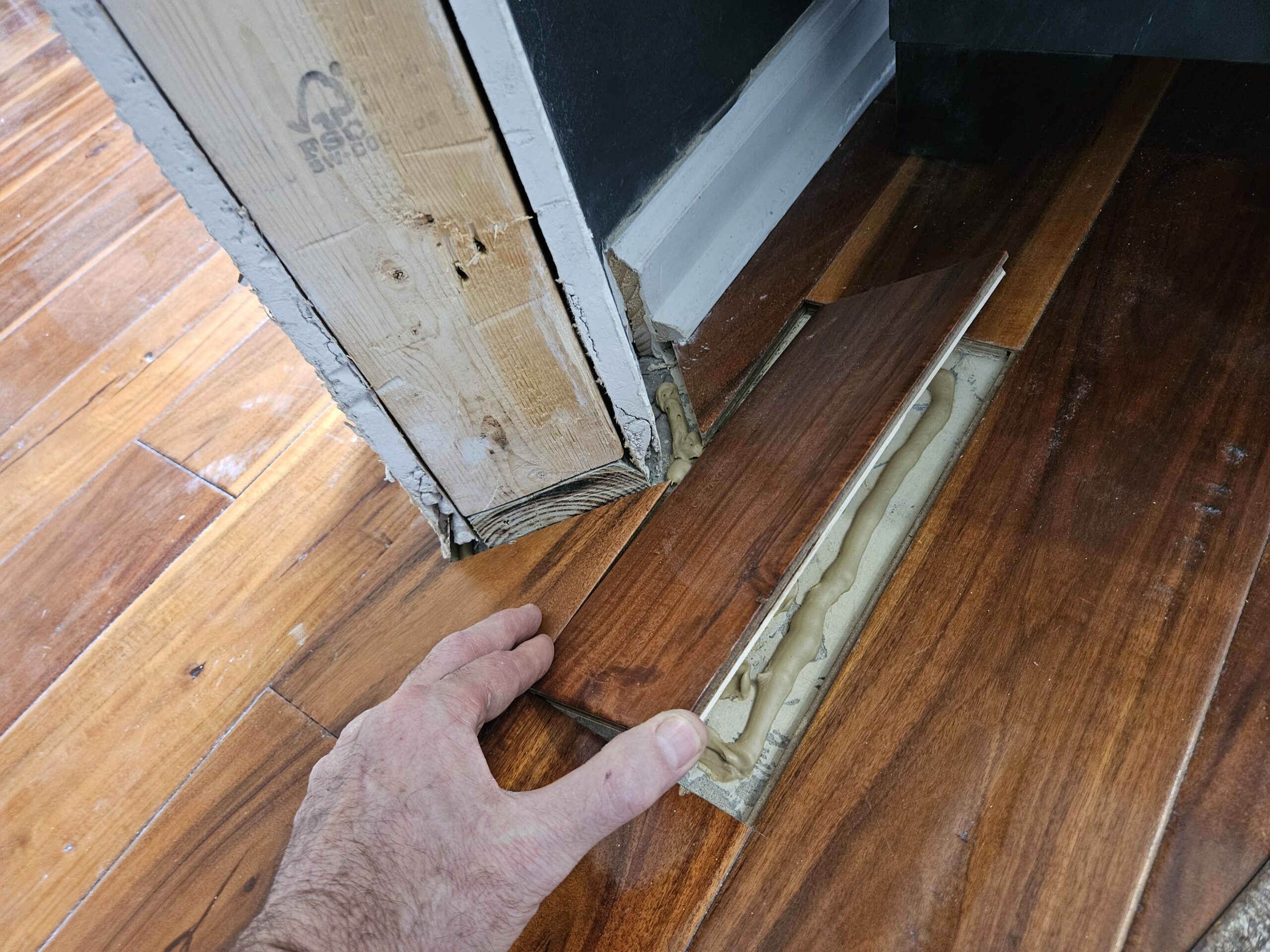 With the rough framing and drywall work complete, I turned my attention to the exposed concrete floor sections. This is where custom craftsmanship made all the difference. I carefully modified the existing laminate flooring to extend into the newly widened doorway, creating custom-cut pieces that fit perfectly around the new door frame. The result? A seamless floor transition that looks like it was always there (check out the project photos to see the finished result).