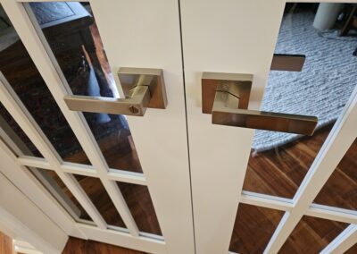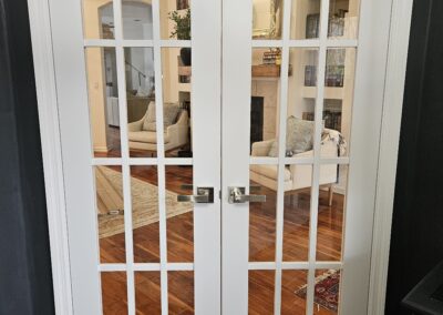 The transformation was dramatic. What was once an open doorway with a transom above is now an elegant entrance featuring white 12-lite French doors that provide both the privacy and soundproofing the homeowner needed for their home office. The brushed nickel hardware adds a modern touch, and the seamless integration with the existing flooring and walls makes it look like a high-end, built-in feature.
